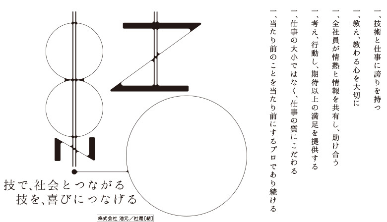 技術と仕事に誇りをもち、教え教わる心を大切にする。全社員が情熱と情報を共有し、助け合い、考え、行動し、期待以上の満足を提供していきます。